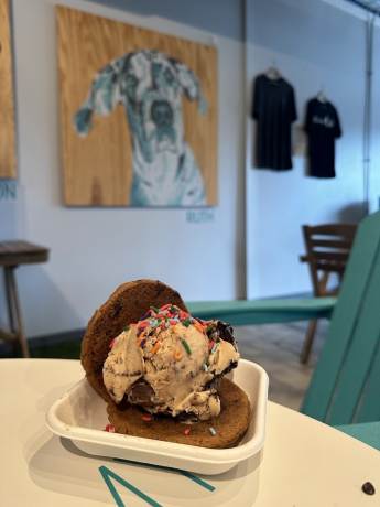 Located in Downtown Mason, Cincy Sammys has perfected the art of satisfying sweet tooths. As you might be able to guess from their name, Cincy Sammys specializes in ice cream sandwiches — offering 5-6 rotating cookie flavors, 8 ice cream choices, an array of sauces and toppings and endless combination possibilities. But this shop isn’t just for ice cream lovers, it’s for dog lovers too. Their name pays tribute not just to their fabulous menu, but also to one of their three “Founding Pups.” Samson, Clark, and Ruth’s portraits all hang inside the shop. They’re not begging for a taste of your sandwich, but they’re not not begging either.