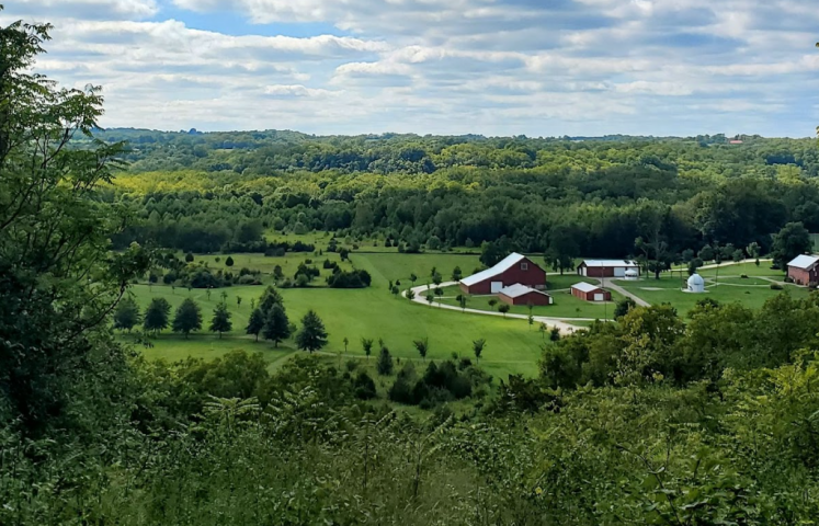 This historic farm property features 158 acres adjacent to the Caesar Creek Nature Preserve and bordering the Little Miami Scenic Bike Scenic River Multipurpose Trail. It features mature, steeply sloped wooded hillsides with scenic overlook, bird watching, hiking and nature trails, restored wetlands, ball fields, fenced dog park, storybook stroll, and natural meadows.